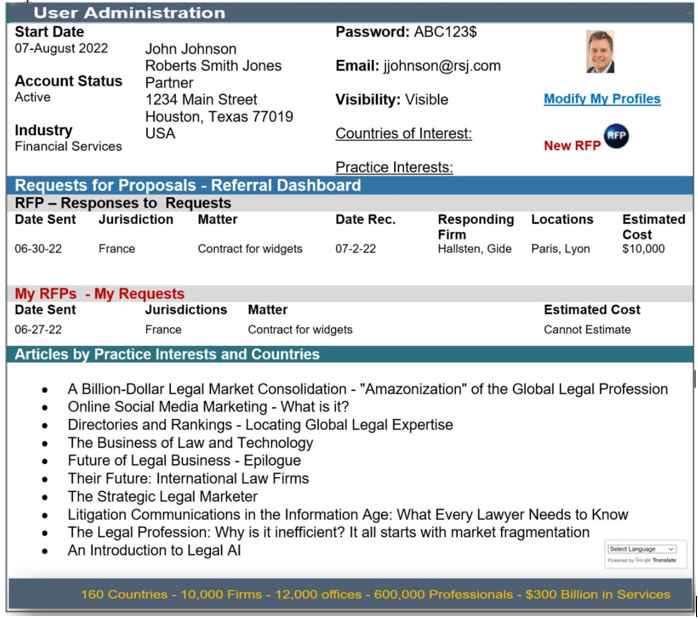 Creating a Personal User ProfileTo access the RFP system, users must create a personal profile. Purpose of the profile: Enables secure submission of RFPs Provides access to a personal dashboard on legal subjects, countries and languages. This ensures confidentiality and controlled disclosure of information. Privacy Protection: Your email address and company/firm name are not disclosed to professional firms unless you explicitly authorize disclosure. Your information is never sold or transferred to third parties |